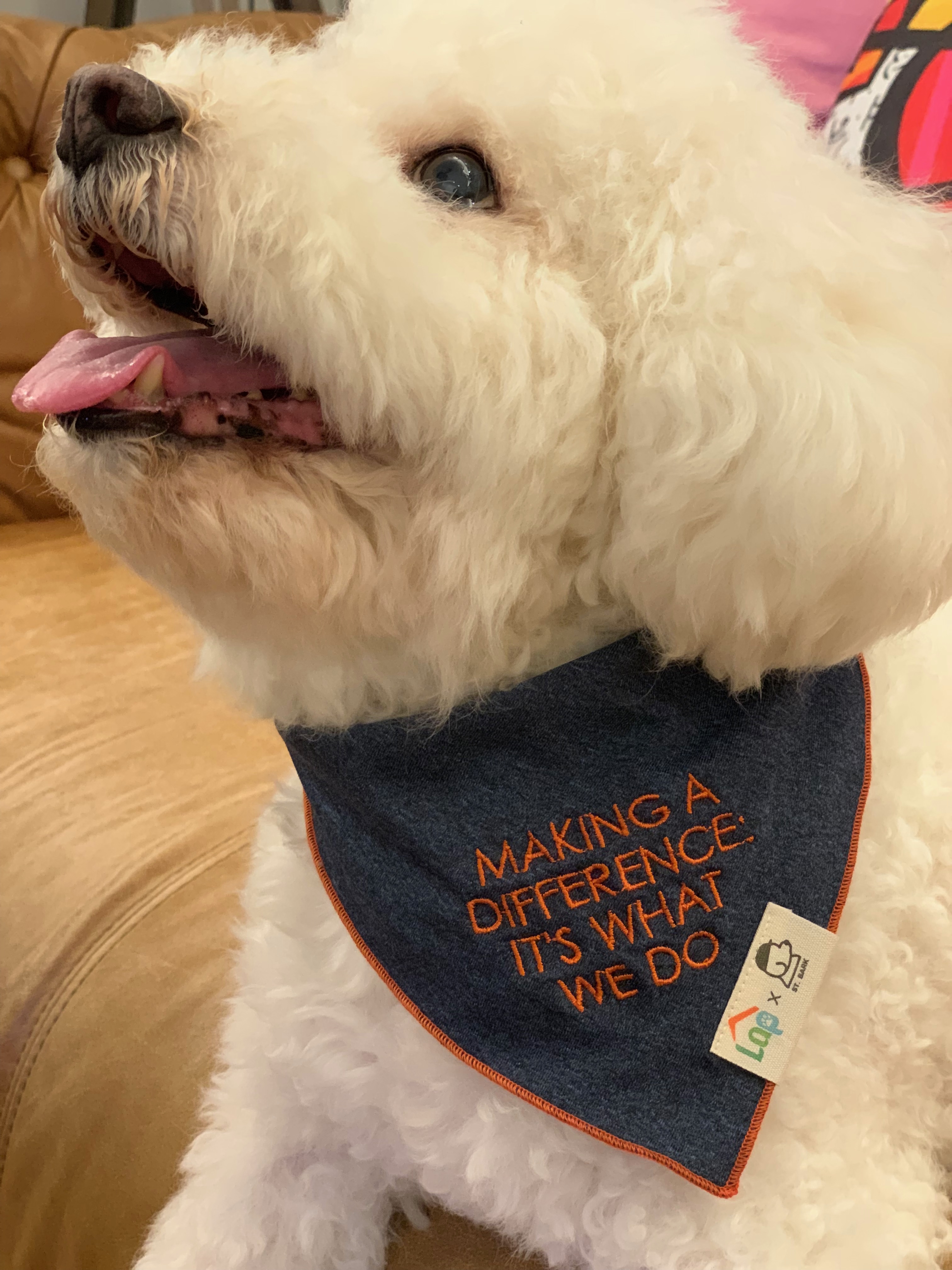 Snoopy, the Chief Happiness Officer of St. Bark, modelling for the charity bandana with the slogan “MAKING A DIFFERENCE: IT’S WHAT WE DO”